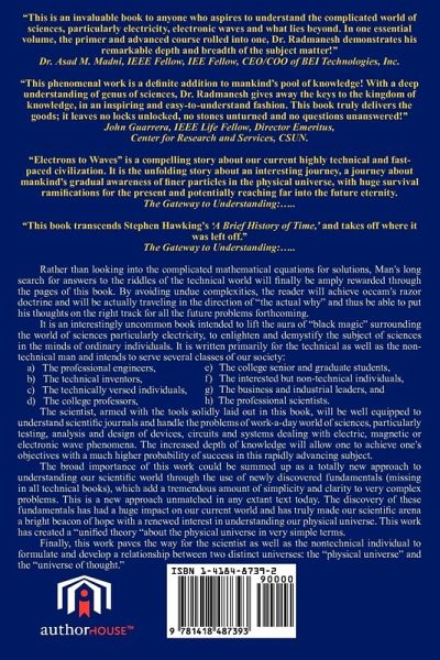 The subject of waves particularly, electronic waves, has been piecemealed to a point where every text covers only a small part of the subject and leaves the rest to someone else to develop. At the present moment, there is no coherent and one-stop approach that covers this material from A to Z and presents it in such a way that an average person can wrap his wits around it. There has been a need for such a book for quite some time. Over the last hundred years, the field of electronic waves, initially placed on a firm ground by James Clerk Maxwell, has grown and blossomed magnificently, primarily in the area of applications to match up with the mathematical sophistication with which Maxwell's equations was presented. Today, almost anyone in our highly technological society strives toward a higher understanding of the inner workings of electronic equipment and desires to know the major principles behind this fascinating form of energy called electricity and electronic waves, and yet most electrical books present the basic concepts with so much complexity and filled with so many mathematical equations that the average individual has given up on the subject and perforce has decided to retire to the sideline to be a spectator on the subject. In other words, their hope has been dashed aside and their dream of a higher understanding has not been fulfilled in any of the modern texts on electricity The present work is the culmination of many years of study, observation and pondering on the dilemmas and enigmas of the physical universe in which we live with particular attention to electronic waves. In this work the origin of electronic waves and the resultant understandings that has been extracted from years of study of this sophisticated and at times incomprehensible subject, is presented with many lucid examples and applications. Within the confines of this book, one is given a chance for the first time to take an in- depth look and inspect first-hand, one of the most dynamic fields of study that has ever been developed in the history of mankind on this planet. The basics are laid in simple terms and clear explanations express the powerful principles lucidly and dynamically, providing an unforgettable impression in the reader's mind. Rather than looking into the complicated mathematical equations for solutions, Man's long search for answers to the riddles of the technical world will finally be amply rewarded through the pages of this book. By avoiding undue complexities, the reader will achieve occum's razor doctrine and will be actually traveling in the direction of "the actual why" and thus be able to put his thoughts on the right track for all the future problems forthcoming. It is an interestingly uncommon book intended to lift the aura of "black magic" surrounding the world of sciences particularly electricity, to enlighten and demystify the subject of sciences in the minds of ordinary individuals. It is written primarily for the technical as well as the non-technical man and intends to serve several classes of our society: a) The professional engineers, b) The technical inventors, c) The technically versed individuals, d) The college professors, e) The college senior and graduate students, f) The interested but non-technical individuals, and g) The business and industrial leaders. The scientist, armed with the tools solidly laid out in this book, will be well equipped to understand scientific journals and handle the problems of work-a-day world of sciences, particularly testing, analysis and design of devices, circuits and systems dealing with electric, magnetic or electronic wave phenomena. The increased depth of knowledge will allow one to achieve one's objectives with a much higher probability of success in this rapidly advancing subject.