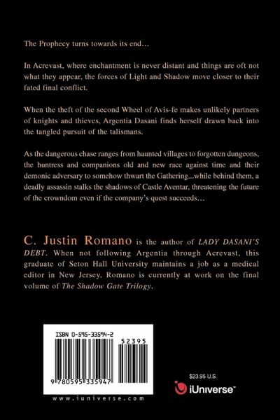 The Prophecy turns towards its end... In Acrevast, where enchantment is never distant and things are oft not what they appear, the forces of Light and Shadow move closer to their fated final conflict. When the theft of the second Wheel of Avis-fe makes unlikely partners of knights and thieves, Argentia Dasani finds herself drawn back into the tangled pursuit of the talismans. As the dangerous chase ranges from haunted villages to forgotten dungeons, the huntress and companions old and new race against time and their demonic adversary to somehow thwart the Gathering...while behind them, a deadly assassin stalks the shadows of Castle Aventar, threatening the future of the crowndom even if the company's quest succeeds...