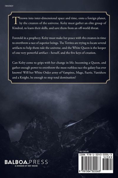 Thrown into inter-dimensional space and time, onto a foreign planet, by the creators of the universe. Koby must gather an elite group of Kindred, to learn their skills, and save them from an off-world threat. Foretold in a prophecy, Koby must make her peace with the creators in time to overthrow a race of superior beings. The Territes are trying to locate several artifacts to help them rule the universe, and the White Queen is the keeper of one very powerful artifact - herself, and the five keys of creation. Can Koby come to grips with her change in life; becoming a Queen, and gather enough power to overthrow the most ruthless race the galaxy has ever known? Will her White Order army of Vampires, Mage, Faerie, Vanishers and a Knight, be enough to stop total domination?