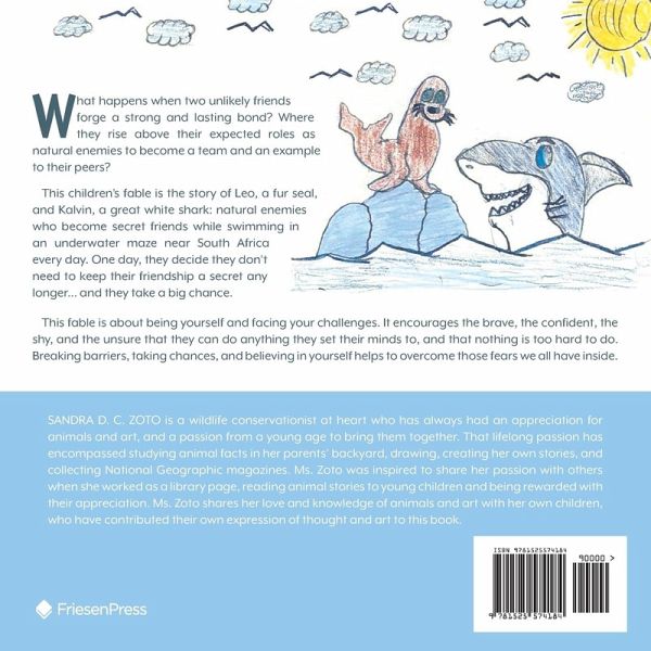 What happens when two unlikely friends forge a strong and lasting bond? Where they rise above their expected roles as natural enemies to become a team and an example to their peers? This children's fable is the story of Leo, a fur seal, and Kalvin, a great white shark: natural enemies who become secret friends while swimming in an underwater maze near South Africa every day. One day, they decide they don't need to keep their friendship a secret any longer... and they take a big chance. This fable is about being yourself and facing your challenges. It encourages the brave, the confident, the shy, and the unsure that they can do anything they set their minds to, and that nothing is too hard to do. Breaking barriers, taking chances, and believing in yourself helps to overcome those fears we all have inside....