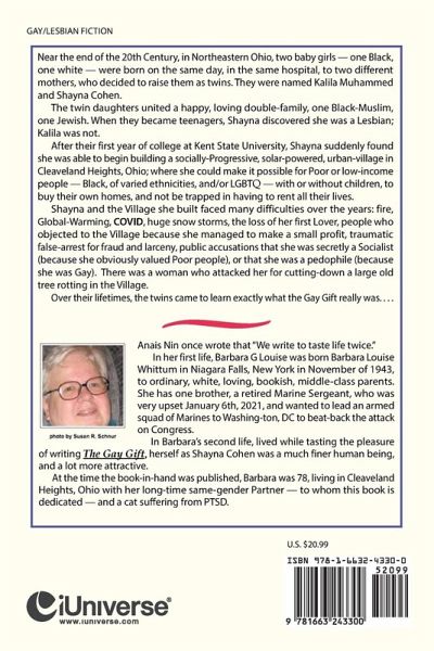 Near the end of the 20th Century, in Northeastern Ohio, two baby girls - one Black, one white - were born on the same day, in the same hospital, to two different mothers, who decided to raise them as twins. They were named Kalila Muhammed and Shayna Cohen. The twin daughters united a happy, loving double-family, one Black-Muslim, one Jewish. When they became teenagers, Shayna discovered she was a Lesbian; Kalila was not. After their first year of college at Kent State University, Shayna suddenly found she was able to begin building a socially-Progressive, solar-powered, urban-village in Cleaveland Heights, Ohio; where she could make it possible for Poor or low-income people - Black, of varied ethnicities, and/or LGBTQ - with or without children, to buy their own homes, and not be trapped in having to rent all their lives. Shayna and the Village she built faced many difficulties over the years: fire, Global-Warming, COVID, huge snow storms, the loss of her first Lover, people who objected to the Village because she managed to make a small profit, traumatic arrest for fraud and larceny, public accusations that she was secretly a Socialist (because she obviously valued Poor people), or that she was a pedophile (because she was Gay). There was a woman who attacked her for cutting-down a large old tree rotting in the Village. Over their lifetimes, the twins came to learn exactly what the Gay Gift really was. . . .