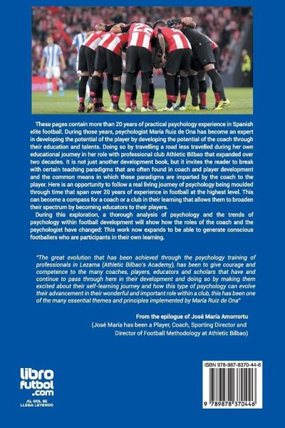 These pages contain more than 20 years of practical psychology experience in Spanish elite football. During those years, psychologist María Ruiz de Ona has become an expert in developing the potential of the player by developing the potential of the coach through their education and talents. Doing so by travelling a road less travelled during her own educational journey in her role with professional club Athletic Bilbao that expanded over two decades. It is not just another development book, but it invites the reader to break with certain teaching paradigms that are often found in coach and player development and the common means in which these paradigms are imparted by the coach to the player. Here is an opportunity to follow a real living journey of psychology being moulded through time that span over 20 years of experience in football at the highest level. This can become a compass for a coach or a club in their learning that allows them to broaden their spectrum by becoming educators to their players. During this exploration, a thorough analysis of psychology and the trends of psychology within football development will show how the roles of the coach and the psychologist have changed: This work now expands to be able to generate conscious footballers who are participants in their own learning. "The great evolution that has been achieved through the psychology training of professionals in Lezama (Athletic Bilbao's Academy), has been to give courage and competence to the many coaches, players, educators and scholars that have and continue to pass through here in their development and doing so by making them excited about their self-learning journey and how this type of psychology can evolve their advancement in their wonderful and important role within a club, this has been one of the many essential themes and principles implemented by María Ruiz de Ona"