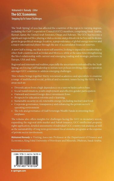 The volume also offers insights for challenges facing the GCC in monetary union, expanding the regional debt market and Sukuk issuance, GCC intellectual property rights application, detailed assessments of individual GCC country risk analysis,as well as the sustainability of long term government fiscal stimulus programs at the expense of private sector involvement.