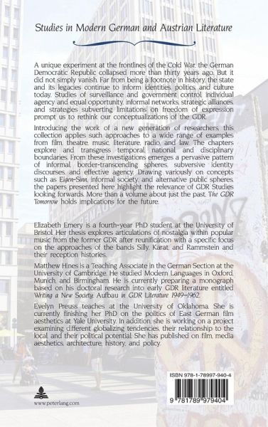 Contents: Elizabeth Emery, Matthew Hines, and Evelyn Preuss: Introduction: The GDR Tomorrow - The East German Project and its Democratic (Dis)Contents - GDR without Borders: Transnational Perspectives - George Gibson: Briefe ohne Unterschrift: Transnational Identity in the GDR - Yundi Guo: Butterfly over the Wall: Herz's Madam Butterfly (1978) and Its Journey from the Komische Oper to the Welsh National Opera - German Democratic Aesthetics: Co-Authorship and Subversive Audiences - Matthew Hines: A «Productive» Alternative to Socialist Realism in Peter Hacks and Heiner Müller - Anja Thiele: Twofold Testimonies: Jewish Memory of the Holocaust in GDR Fiction - Evelyn Preuss: Hollywood behind the Wall? (Dis)Continuities between Love Story (1970) and Die Legende von Paul und Paula (1973) - «To Be Continued»: The GDR's Memory Tomorrow - Beyond 1989: Law and the Instrumentality of the Past - Philipp Ebert: Socialist State Crime, Transitional Justice, and the Question of Individual Responsibility in Germany, 1984-1992 - Alexander D. Brown: Paul Merker: «Ein Moment kommunistischer Ungleichzeitigkeit»? - (N)Ostalgie: Future as History - History as Future? - Elizabeth Emery: «Wenn die Zeit endlos wär, so wie Sand am Meer ... Wünsch ich mir ein Stück davon jetzt zurück»: (N)Ostalgie in East German Popular Music - Anandita Bajpai: Objects of Love: Remembering Radio Berlin International in India - Elizabeth Emery, Matthew Hines, and Evelyn Preuss: Conclusion: GDR Studies Today and Tomorrow.