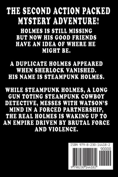 HOLMES IS STILL MISSING BUT NOW HIS GOOD FRIENDS HAVE AN IDEA OF WHERE HE MIGHT BE. A DUPLICATE HOLME APPEARED WHN SHERLOCK VANISHED. HIS NAME IS STEAMPUNK HOLMES. WHILE STEAMPUNK HOLMES, A LONG GUN TOTING STEAMPUNK COWBOY DETECTIVE MESSES WITH WATSON'S MIND IN A FORCED PARTNERSHIP, THE REAL HOLMES IS WAKING UP TO AN EMPIRE DRIVE BY BRUTAL FORCE AND VIOLENCE.