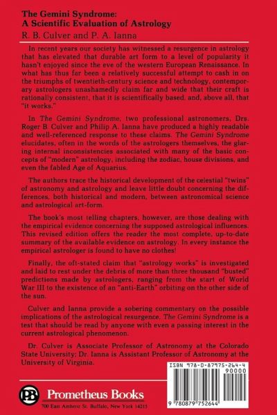 In recent years, our society has witnessed a resurgence in astrology that has elevated that durable art form to a level of popularity it hasn't enjoyed since the eve of western European Renaissance. In what has thus far been a relatively successful attempt to cash in on the triumphs of twentieth-centiry science and technology, contemporary astrologers unashamedly claim far and wide that their craft is rationally consistent, that it is scientifically based, and, above all, that "it works." In The Gemini Syndrome, two professional astronomers have produced a highly readable and well-referenced response to claims by astrologers that their theories are scientifically based. The authors elucidate the glaring internal inconsistencies associated with many of the basic concepts of "modern" astrology. They trace the historical development of the celestial "twins" of astronomy and astrology and leave little doubt concerning the differences, both historical and modern, between astronomical science and astrological art-form. The book's most telling chapters are those dealing with the empirical evidence concerning the supposed astrological influences. Culver and Ianna offer the reader what is the most complete summary of the available data about sun-signs, houses, and aspects. In every instance the empirical astrologer is found to have no clothes on! Finally, the oft-stated claim that "astrology works" is investigated and laid to rest under the debris of more than three thousand "busted" predictions made by the astrologers themselves, ranging from the start of World War III to the existence of an "anti-earth" orbiting on the other side of the sun.