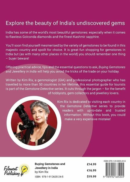Explore the beauty of India's undiscovered gems! India has some of the world's most beautiful gemstones: especially when it comes to flawless Golconda diamonds and the finest Kashmir sapphire. You'll soon find yourself mesmerised by the variety of gemstones to be found in this majestic country and spoilt for choice. It is great fun shopping for gemstones in India but (as with many other places in the world) you should remember one thing - buyer beware! Offering practical advice, tips and the essential questions to ask, Buying Gemstones and Jewellery in India will help you avoid the tricks of the trade on your holiday. Written by Kim Rix, a gemmologist (GIA) and professional photographer who has travelled to more than 50 countries in her lifetime, this essential guide for tourists is part of the Gemstone Detective series. It cuts through the jargon - for the benefit of hobbyists, gem collectors and jewellery lovers. Kim Rix is dedicated to visiting each country in the Gemstone Detective series to provide readers with up-to-date and trusted information. Without this book, you could make a very expensive mistake!