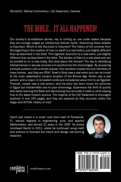Society's foundational stories, key to uniting us, are under attack because they are judged as unhistorical biblical myths. What if that judgment is wrong? In that case, debunking these attacks would be important. Which is why this book is important! The history of the universe from the beginning to the creation of man on earth is a real history, just slightly different than as described in the bible. The cognitive revolution is a real event, just slightly different than as described in the bible. The Garden of Eden is a real place and can be pointed to on a map today. But what about the heroes? The key to identifying biblical heroes in secular sources is to synchronize the chronologies. By answering a simple question with a simple answer, this narrative is based on an alternative chronology that unmasks identities of many heroes...and they are REAL! Noah's flood was a real event and can be linked to the most catastrophic volcanic eruption of the Bronze Age. Abram was a real person, and a mayor of Jerusalem wrote and complained about him to an Egyptian Pharoah. Joseph was a real person, and his story has been known for centuries in Egypt but misidentified due to poor chronology. Moses is in the Egyptian records once you look in the right time period! And the histories of these hero's matter. They matter because the record of their history in the Bible records the maturation of an explanation for the fundamental question everyone wants to know the answer to: why? Experience the thrill of quickly and easily learning the Bible and discovering how accurate it really is while staying true to the latest modern science. The majority of the Old Testament is thoroughly explored in less than 250 pages, and they are explored as they occurred, within the larger history of man! History, alternative history, biblical history, Ancient Near East geography, military analysis, mathematics, metallurgy, the Bronze Age Collapse, archeology, linguistics, even climate change, all these topics make their appearance in these pages to help explain what the latest scholarship believes to be true about the Bible. Although this book is clearly written by a modern scientist and mathematician, it is truly hoped that it is seen for what is intended to be: a modern-day apologetic. To serve that role, it was written in a way that is hopefully easy to read and not filled with dense notes. It hopefully includes enough information to get the curious started on their own investigations. And it is hopefully clear that the author respects and is in awe of the biblical authors.