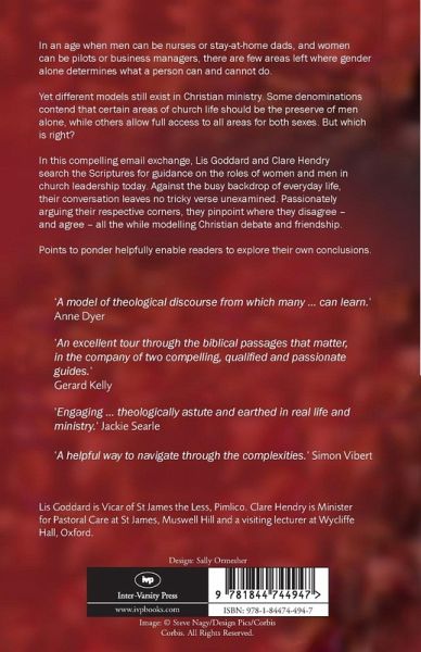In an age when men can be nurses or stay-at-home dads and women can be pilots or business managers, there are few areas left where gender alone determines what a person can and cannot do. Yet different models still exist in Christian ministry. Some denominations contend that certain areas of church life should be the preserve of men alone, while others allow full access to all areas for both sexes. But which is right? In this compelling email exchange, Lis Goddard and Clare Hendry search the Scriptures for guidance on the roles of women and men in church leadership today. Against the busy backdrop of everyday life, their conversation covers all the key passages, leaving no tricky verse unexamined. Passionately arguing their respective corners, they pinpoint where they disagree - and agree - all the while modelling Christian debate and friendship. Points to ponder helpfully enable readers to explore their own conclusions.