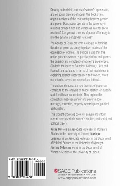 Drawing on feminist theories of women's oppression and on social theories of power, this book offers original analyses of the relationship between gender and power. The Gender of Power presents a critique of feminist theories of power as simply top-down models of the oppression of women. The authors argue that this notion presents women as passive victims and ignores the diversity and complexity of women's experiences. The ideas on power of Bourdieu, Giddens, Lukes and Foucault are also evaluated in terms of their usefulness in explaining relations between men and women, which can often be covert, consensual and intimate.