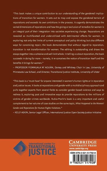 Introduction: a gender and reparations taxonomy Ruth Rubio-Marín; 1. Gender and violence in focus: a background for gender justice in reparations Margaret Urban Walker; 2. The gender of reparations in transitional societies Ruth Rubio-Marín; 3. Reparation of sexual and reproductive violence: moving from codification to implementation Colleen Duggan and Ruth Jacobson; 4. Reparations as a means for recognizing and addressing crimes and grave rights violations against girls and boys during situations of armed conflict and under authoritarian and dictatorial regimes Dyan Mazurana and Khristopher Carlson; 5. Repairing family members: gross human rights violations and communities of harm Ruth Rubio-Marín, Clara Sandoval, and Catalina Díaz; 6. Tort theory, microfinance, and gender equity convergent in pecuniary reparations Anita Bernstein; 7. Gender, memorialization, and symbolic reparations Brandon Hamber and Ingrid Palmary; 8. Gender and collective reparations in the aftermath of conflict and political repression Ruth Rubio-Marín.