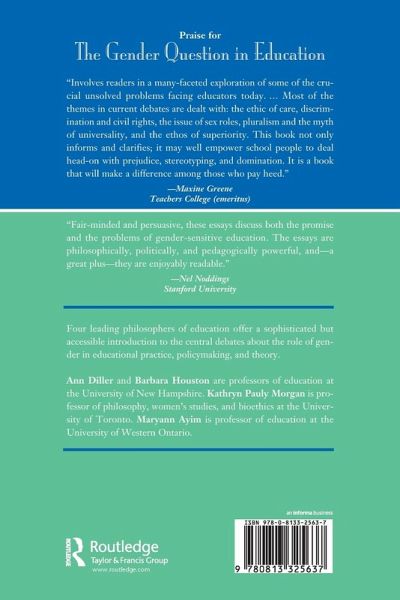 In this innovative book, four prominent philosophers of education introduce readers to the central debates about the role of gender in educational practice, policymaking, and theory. More a record of a continuing conversation than a statement of a fixed point of view, The Gender Question in Education enables students and practicing teachers to think through to their own conclusions and to add their own voices to the conversation.Throughout, the authors emphasize the value of a gender-sensitive perspective on educational issues and the relevance of an ethics of care for educational practice.…mehr