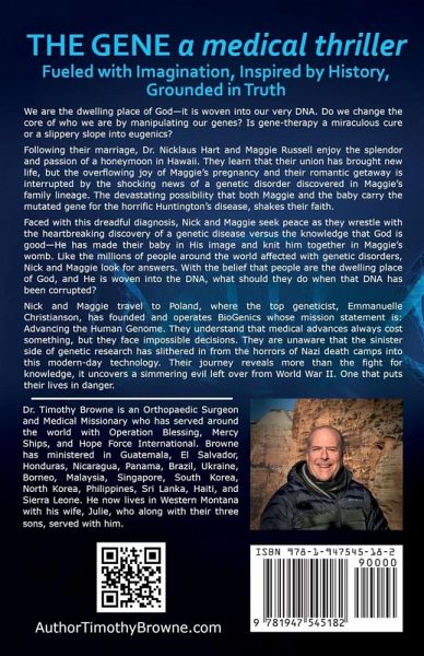 We are the dwelling place of God-it is woven into our very DNA. Do we change the core of who we are by manipulating our genes? Is gene-therapy a miraculous cure or a slippery slope into eugenics? Following their marriage, Dr. Nicklaus Hart and Maggie Russell enjoy the splendor and passion of a honeymoon in Hawaii. They learn that their union has brought new life, but the overflowing joy of Maggie's pregnancy and their romantic getaway is interrupted by the shocking news of a genetic disorder discovered in Maggie's family lineage. The devastating possibility that both Maggie and the baby carry the mutated gene for the horrific Huntington's disease, shakes their faith. Faced with this dreadful diagnosis, Nick and Maggie seek peace as they wrestle with the heartbreaking discovery of a genetic disease versus the knowledge that God is good-He has made their baby in His image and knit him together in Maggie's womb. Like the millions of people around the world affected with genetic disorders, Nick and Maggie look for answers. With the belief that people are the dwelling place of God, and He is woven into the DNA, what should they do when that DNA has been corrupted? Nick and Maggie travel to Poland, where the top geneticist, Emmanuelle Christianson, has founded and operates BioGenics whose mission statement is: Advancing the Human Genome. They understand that medical advances always cost something, but they face impossible decisions. They are unaware that the sinister side of genetic research has slithered in from the horrors of Nazi death camps into this modern-day technology. Their journey reveals more than the fight for knowledge, it uncovers a simmering evil left over from World War II. One that puts their lives in danger. The Gene is the fourth book in a series of skillfully crafted medical thrillers. If you like fast-paced adventure, international settings, sizzling medical suspense, then you'll love this heart-pounding thriller by Timothy Browne.