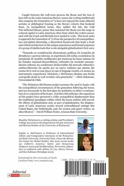 Caught between the well-worn grooves the Boom and the Gen-X have left on the Latin American literary canon, the writing intellectuals that comprise what the Generation of '72 have not enjoyed the same editorial acclaim or philological framing as the literary cohorts that bookend them. In sociopolitical terms, they neither fed into the Cold War-inflected literary prizes that sustained the Boom nor the surge in cultural capital in Latin American cities from which the writers associated with the Crack and McOndo have tended to write. This book seeks to approach the Generation of '72 from the perspective of cosmopolitanism and global citizenship, a theoretical framework that lends a fresh and critical architecture to the unique experiences and formal responses of a group of intellectuals that wrote alongside globalization's first wave.