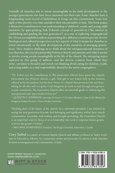 Virtually all churches aim to invest meaningfully in the faith development of the younger generations who have been entrusted into their care. Some churches have a longstanding track record of faithfulness in living out this commitment. Some lose sight of this priority over time and allow their intentionality to fade. This book makes a distinctive contribution to our understanding of children's, youth, and young adult ministries by appropriating Erik Erikson's concept of generativity (""the interest in establishing and guiding the next generation"") as a way of exploring congregational life. Eleven accomplished authors representing five different countries provide diverse theological and cultural perspectives on key aspects of what it means for churches to invest intentionally in the faith development of the members of emerging generations. Their chapters challenge us to think about the intergenerational dynamics of our churches, the crucial partnership between church and parents, and what it means to involve young people meaningfully in the life of the church. The intriguing topics explored by this group of authors--and the diverse contexts from which they write--promise to broaden and enrich our thinking about caring for children, youth, and young adults as a vital responsibility shared by the entire congregation.