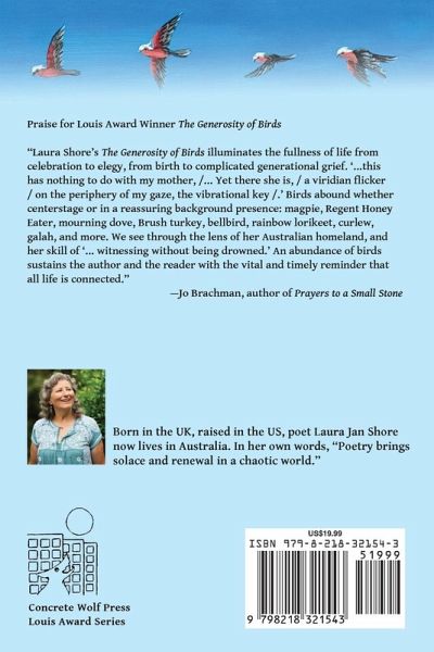 "Laura Shore's The Generosity of Birds illuminates the fullness of life from celebration to elegy, from birth to complicated generational grief. '...this has nothing to do with my mother, /... Yet there she is, / a viridian flicker / on the periphery of my gaze, the vibrational key /.' Birds abound whether centerstage or in a reassuring background presence: magpie, Regent Honey Eater, mourning dove, Brush turkey, bellbird, rainbow lorikeet, curlew, galah, and more. We see through the lens of her Australian homeland, and her skill of '... witnessing without being drowned.' An abundance of birds sustains the author and the reader with the vital and timely reminder that all life is connected." -Jo Brachman, author of Prayers to a Small Stone