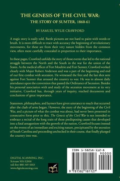 A tragic story is easily told. Battle pictures are not hard to paint with words or brush. It is more difficult to trace with accuracy the beginning of revolutionary movements, for these are from their very nature hidden from the common view, often more carefully concealed in proportion to their importance. In these pages, Crawford unfolds the story of those events that led to the national struggle between the North and the South in the war for the union of the States. As the medical officer of Fort Moultrie and Fort Sumter, Crawford worked closely with Major Robert Anderson and was a part of the beginning and end of our first combat with secession. He witnessed the first and the last shot sent against Fort Sumter that aroused the country to war. He was in almost daily attendance upon the convention that passed the Ordinance of Secession. Besides his personal association with and study of the secession movement at its very initiative, Crawford has, through years of inquiry, reached documents and conclusions of great importance. Statesmen, philosophers, and laymen have given utterance to much that occurred after the clash of arms began. However, the story of the beginning of the Civil War, and a picture of what the combat was about, had never been presented in consecutive form prior to this. The Genesis of the Civil War is not intended to embrace a recital of the long train of those predisposing causes that developed into a fatal antagonism with the growth of the nation. Crawford focuses instead on the events of an immediate and exciting nature, precipitated by the secession of South Carolina and proceeding unchecked in their course, that finally plunged the country into war.