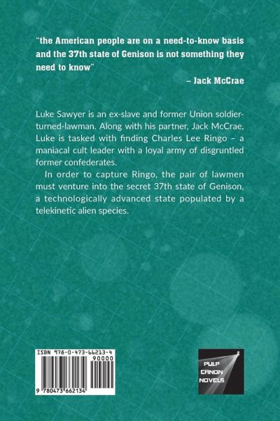 "the American people are on a need-to-know basis and the 37th state of Genison is not something they need to know" - Jack McCrae Luke Sawyer is an ex-slave and former Union soldier-turned-lawman. Along with his partner, Jack McCrae, Luke is tasked with finding Charles Lee Ringo - a maniacal cult leader with a loyal army of disgruntled former confederates. In order to capture Ringo, the pair of lawmen must venture into the secret 37th state of Genison, a technologically advanced state populated by a telekinetic alien species.