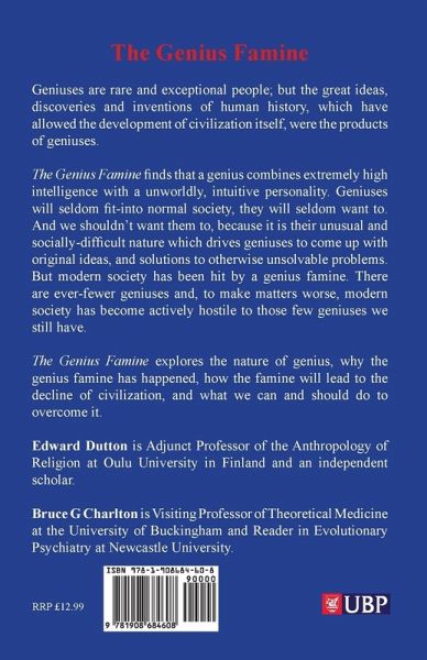 We live in a society where, for whatever reason, genius tends to be unacknowledged, denied, ignored or even (usually for 'politically correct' reasons) actively persecuted. For the past four hundred years, geniuses have been common to all the major humanities and sciences, art, literature, medicine, law, politics, the military and religion - yet today they have almost disappeared. A genius combines extremely high intelligence with an unworldly, intuitive personality. Geniuses will seldom fit into normal society; they will seldom want to. Nor should they, since it is their unusual and socially-difficult nature which drives geniuses to come up with original ideas, make breakthrough discoveries or solve unyielding problems by intuitive insight. But modern society has been hit by a genius famine. There are ever fewer geniuses and modern society has become actively hostile to those we still have. The Genius Famine explores the nature of genius, why the genius famine has happened, how it threatens civilization and what we can and should do to overcome it.