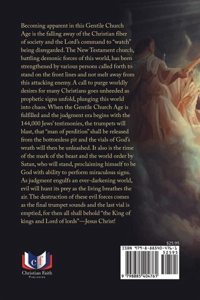 Becoming apparent in this Gentile Church Age is the falling away of the Christian fiber of society and the Lord's command to "watch" being disregarded. The New Testament church, battling demonic forces of this world, has been strengthened by various persons called forth to stand on the front lines and not melt away from this attacking enemy. A call to purge worldly desires for many Christians goes unheeded as prophetic signs unfold, plunging this world into chaos. When the Gentile Church Age is fulfilled and the judgment era begins with the 144,000 Jews' testimonies, the trumpets will blast, that "man of perdition" shall be released from the bottomless pit and the vials of God's wrath will then be released. It also is the time of the mark of the beast and the world order by Satan, who will stand, proclaiming himself to be God with ability to perform miraculous signs. As judgment engulfs an ever-darkening world, evil will hunt its prey as the living breathes the air. The destruction of these evil forces comes as the final trumpet sounds and the last vial is emptied, for then all shall behold "the King of kings and Lord of lords"--Jesus Christ!