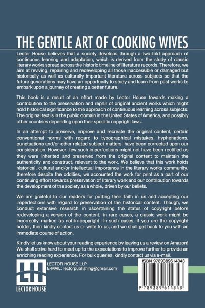 The Gentle Art Of Cooking Wives This book is a result of an effort made by us towards making a contribution to the preservation and repair of original classic literature. In an attempt to preserve, improve and recreate the original content, we have worked towards: 1. Type-setting & Reformatting: The complete work has been re-designed via professional layout, formatting and type-setting tools to re-create the same edition with rich typography, graphics, high quality images, and table elements, giving our readers the feel of holding a 'fresh and newly' reprinted and/or revised edition, as opposed to other scanned & printed (Optical Character Recognition - OCR) reproductions. 2. Correction of imperfections: As the work was re-created from the scratch, therefore, it was vetted to rectify certain conventional norms with regard to typographical mistakes, hyphenations, punctuations, blurred images, missing content/pages, and/or other related subject matters, upon our consideration. Every attempt was made to rectify the imperfections related to omitted constructs in the original edition via other references. However, a few of such imperfections which could not be rectified due to intentional\unintentional omission of content in the original edition, were inherited and preserved from the original work to maintain the authenticity and construct, relevant to the work. We believe that this work holds historical, cultural and/or intellectual importance in the literary works community, therefore despite the oddities, we accounted the work for print as a part of our continuing effort towards preservation of literary work and our contribution towards the development of the society as a whole, driven by our beliefs. We are grateful to our readers for putting their faith in us and accepting our imperfections with regard to preservation of the historical content. HAPPY READING!