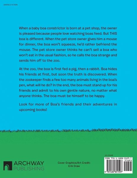 When a baby boa constrictor is born at a pet shop, the owner is pleased because people love watching boas feed. But THIS boa is different. When the pet store owner gives him a mouse for dinner, the boa won't squeeze, he'd rather befriend the mouse. The pet store owner thinks he can't sell a boa who won't eat in the usual fashion, so he calls the boa strange and sends him off to the zoo. At the zoo, the boa is first fed a pig, then a rabbit. Boa hides his friends at first, but soon the truth is discovered. When the zookeeper finds a few too many animals living in the boa's pen, what will he do? In the end, the boa must stand up for his friends and admit to his own gentle nature, no matter what anyone thinks. The boa must be himself to be happy. Look for more of Boa's friends and their adventures in upcoming books!