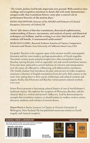 Euripides' Bacchae is the magnum opus of the ancient world's most popular dramatist and the most modern, perhaps postmodern, of Greek tragedies. Twentieth-century poets and playwrights have often turned their hand to Bacchae, leaving the play with an especially rich and varied translation history. It has also been subjected to several fashions of criticism and interpretation over the years, all reflected in, influencing, and influenced by translation. The Gentle, Jealous God introduces the play and surveys its wider reception; examines a selection of English translations from the early 20th century to the early 21st, setting them in their social, intellectual, and cultural context; and argues, finally, that Dionysus and Bacchae remain potent cultural symbols even now. Simon Perris presents a fascinating cultural history of one of world theatre's landmark classics. He explores the reception of Dionysus, Bacchae, and the classical ideal in a violent and turmoil-ridden era. And he demonstrates by example that translation matters, or should matter, to readers, writers, actors, directors, students, and scholars of ancient drama.