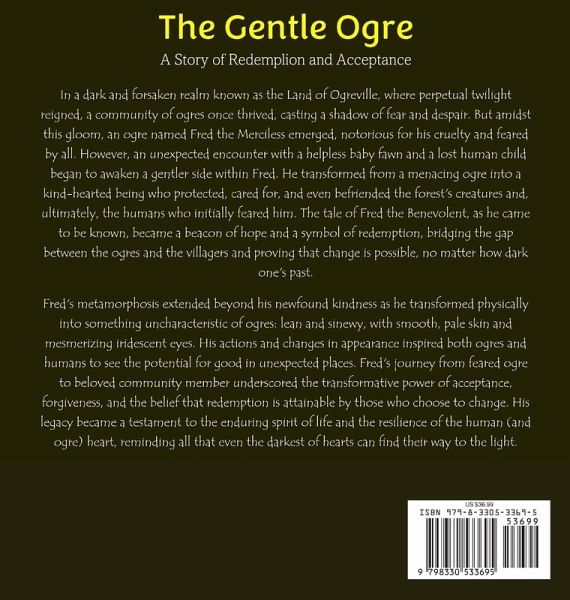 The Gentle Ogre" is a heartwarming tale set in the gloomy Land of Ogreville, where Fred the Merciless, a fearsome ogre, reigns with an iron fist. His life takes an unexpected turn when he encounters a defenseless baby fawn and a lost human child, sparking a transformation from brute to benefactor. This story of redemption unfolds as Fred becomes an emblem of hope, demonstrating that even the most daunting beings are capable of profound change. His journey from dreaded beast to cherished protector reshapes not only his destiny but also the lives of those around him, challenging the long-standing fears and prejudices between ogres and humans. Through his evolution, Fred illustrates the transformative power of compassion, acceptance, and the possibility of redemption for all. His legacy is a testament to the belief that even the bleakest souls can find their way to light, fostering a message of unity and the enduring resilience of life.