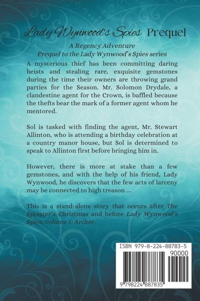 Large Print Edition A Regency Adventure Prequel to the Lady Wynwood's Spies series A mysterious thief has been committing daring heists and stealing rare, exquisite gemstones during the time their owners are throwing grand parties for the Season. Mr. Solomon Drydale, a clandestine agent for the Crown, is baffled because the thefts bear the mark of a former agent whom he mentored. Sol is tasked with finding the agent, Mr. Stewart Allinton, who is attending a birthday celebration at a country manor house, but Sol is determined to speak to Allinton first before bringing him in. However, there is more at stake than a few gemstones, and with the help of his friend, Lady Wynwood, he discovers that the few acts of larceny may be connected to high treason ... This is a stand-alone story that occurs after The Spinster's Christmas and before Lady Wynwood's Spies, volume 1: Archer.