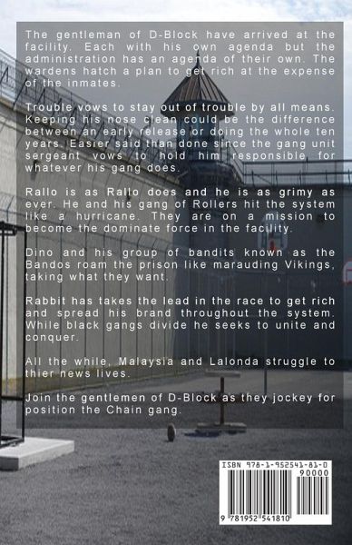 The gentleman of D-Block have arrived at the facility. Each with his own agenda but the administration has an agenda of their own. The wardens hatch a plan to get rich at the expense of the inmates. Trouble vows to stay out of trouble by all means. Keeping his nose clean could be the difference between an early release or doing the whole ten years. Easier said than done since the gang unit sergeant vows to hold him responsible for whatever his gang does. Rallo is as Rallo does and he is as grimy as ever. He and his gang of Rollers hit the system like a hurricane. They are on a mission to become the dominate force in the facility. Dino and his group of bandits known as the Bandos roam the prison like marauding Vikings, taking what they want. Rabbit has takes the lead in the race to get rich and spread his brand throughout the system. While black gangs divide he seeks to unite and conquer. All the while, Malaysia and Lalonda struggle to thier news lives. Join the gentlemen of D-Block as they jockey for position the Chain gang.