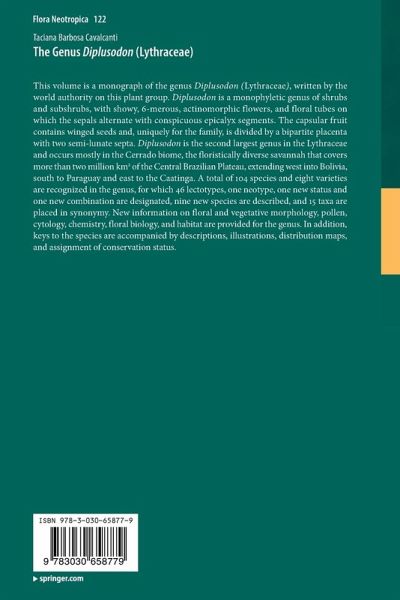 This volume is a monograph of the genus Diplusodon (Lythraceae), written by the world authority on this plant group. Diplusodon is a monophyletic genus of shrubs and subshrubs, with showy, 6-merous, actinomorphic flowers, and floral tubes on which the sepals alternate with conspicuous epicalyx segments. The capsular fruit contains winged seeds and, uniquely for the family, is divided by a bipartite placenta with two semi-lunate septa. Diplusodon is the second largest genus in the Lythraceae and occurs mostly in the Cerrado Biome, the floristically diverse savannah that covers more than two million km2 of the Central Brazilian Plateau, extending west into Bolivia, south to Paraguay and east to the Caatinga. A total of 104 species and eight varieties are recognized in the genus, for which 46 lectotypes, one neotype, one new status and one new combination are designated, nine new species are described, and 15 taxaare placed in synonymy. New information on floral and vegetative morphology, pollen, cytology, chemistry, floral biology, and habitat are provided for the genus. In addition, keys to the species are accompanied by descriptions, illustrations, distribution maps, and assignment of conservation status.