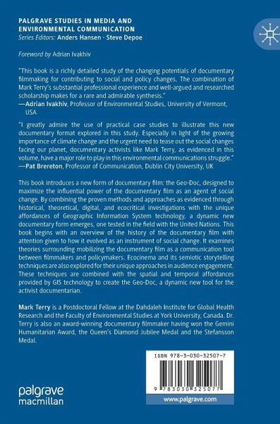 This book introduces a new form of documentary film: the Geo-Doc, designed to maximize the influential power of the documentary film as an agent of social change. By combining the proven methods and approaches as evidenced through historical, theoretical, digital, and ecocritical investigations with the unique affordances of Geographic Information System technology, a dynamic new documentary form emerges, one tested in the field with the United Nations. This book begins with an overview of the history of the documentary film with attention given to how it evolved as an instrument of social change. It examines theories surrounding mobilizing the documentary film as a communication tool between filmmakers and policymakers. Ecocinema and its semiotic storytelling techniques are also explored for their unique approaches in audience engagement. The proven methods identified throughout the book are combined with the spatial and temporal affordances provided by GIS technology to create theGeo-Doc, a new tool for the activist documentarian.