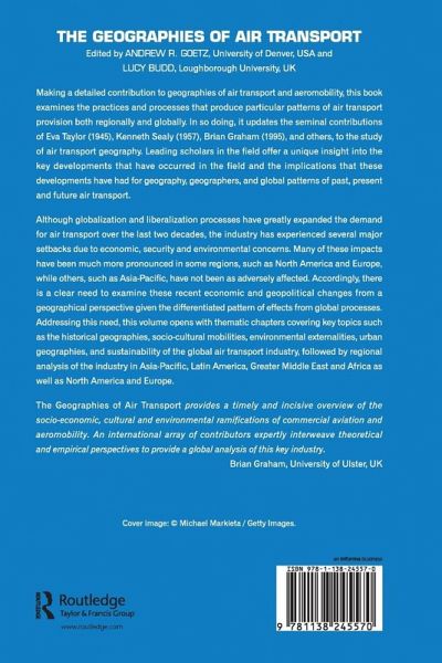 Contents: The geographies of air transport: an introduction Lucy Budd and Andrew R. Goetz. Part I Thematic Approaches: The historical geographies of air transport Lucy Budd; The geopolitics of air transport Keith G. Debbage; The economic geography of air transport John T. Bowen Jr; Social and cultural geographies of air transport Peter Adey and Weiqiang Lin; Environmental externalities of air transport Tim Ryley; The role of airports in air transport Anne Graham and Stephen Ison; Global cities and air transport Ben Derudder and Frank Witlox; The sustainability of air transport Christopher Paling Paul Hooper and Callum Thomas. Part II Regional Approaches: Geographies of air transport in North America Sean Tierney; Geographies of European air transport Frédéric Dobruszkes; Air transport geographies of the Asia-Pacific Kevin O'Connor and Kurt Fuellhart; Geographies of Latin American air transport Gustavo Lipovich; Geographies of Middle Eastern air transport Khaula Alkaabi; Geographies of air transport in Africa: aviation's 'last frontier' Gordon Pirie; Conclusion Andrew R. Goetz and Lucy Budd. Index.