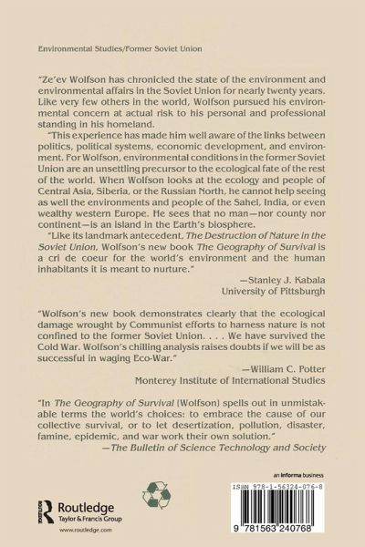 In 1989 a Soviet environmental expert writer under the pseudonym Boris Komarov startled the world. His book "The Destruction of Nature in the Soviet Union", was both a chilling description of the environmental devastation in the Soviet Union and an indictment of the official policy and public apathy that allows it to be perpetuated. Today Boris Komarov writes freely under his own name - Ze'ev Wolfson. But the ecological crisis he documents has only become more severe, more widespread, more deadly. In "The Geography of Survival" Wolfson speaks out in unmistakable terms about the world's choice to embrace the cause of our collective survival or to let desertisation, pollution, disaster, famine, epidemic, and war work their own solution.