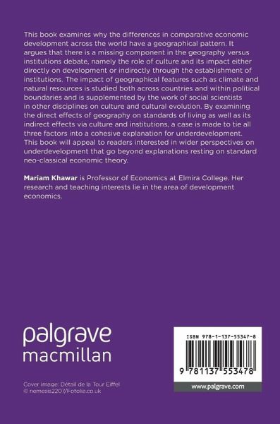 This book examines why the differences in comparative economic development across the world have a geographical pattern. It argues that there is a missing component in the geography versus institutions debate, namely the role of culture and its impact either directly on development or indirectly through the establishment of institutions. The impact of geographical features such as climate and natural resources is studied both across countries and within political boundaries and is supplemented by the work of social scientists in other disciplines on culture and cultural evolution. By examining the direct effects of geography on standards of living as well as its indirect effects via culture and institutions, a case is made to tie all three factors into a cohesive explanation for underdevelopment. This book will appeal to readers interested in wider perspectives on under-development that go beyond explanations resting on standard neo-classical economic theory.