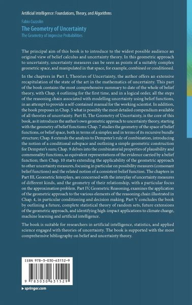 In the chapters in Part I, Theories of Uncertainty, the author offers an extensive recapitulation of the state of the art in the mathematics of uncertainty. This part of the book contains the most comprehensive summary to date of the whole of belief theory, with Chap. 4 outlining for the first time, and in a logical order, all the steps of the reasoning chain associated with modelling uncertainty using belief functions, in an attempt to provide a self-contained manual for the working scientist. In addition, the book proposes in Chap. 5 what is possibly the most detailed compendium available of all theories of uncertainty. Part II, The Geometry of Uncertainty, is the core of this book, as it introduces the author's own geometric approach to uncertainty theory, starting with the geometry of belief functions: Chap. 7 studies the geometry of the space of belief functions, or belief space, both in terms of a simplex and in terms of its recursive bundle structure; Chap. 8 extends the analysis to Dempster's rule of combination, introducing the notion of a conditional subspace and outlining a simple geometric construction for Dempster's sum; Chap. 9 delves into the combinatorial properties of plausibility and commonality functions, as equivalent representations of the evidence carried by a belief function; then Chap. 10 starts extending the applicability of the geometric approach to other uncertainty measures, focusing in particular on possibility measures (consonant belief functions) and the related notion of a consistent belief function. The chapters in Part III, Geometric Interplays, are concerned with the interplay of uncertainty measures of different kinds, and the geometry of their relationship, with a particular focus on the approximation problem. Part IV, Geometric Reasoning, examines the application of the geometric approach to the various elements of the reasoning chain illustrated in Chap. 4, in particular conditioning and decision making. Part V concludes the book by outlining a future, complete statistical theory of random sets, future extensions of the geometric approach, and identifying high-impact applications to climate change, machine learning and artificial intelligence.