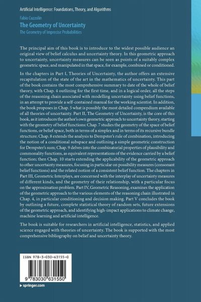 In the chapters in Part I, Theories of Uncertainty, the author offers an extensive recapitulation of the state of the art in the mathematics of uncertainty. This part of the book contains the most comprehensive summary to date of the whole of belief theory, with Chap. 4 outlining for the first time, and in a logical order, all the steps of the reasoning chain associated with modelling uncertainty using belief functions, in an attempt to provide a self-contained manual for the working scientist. In addition, the book proposes in Chap. 5 what is possibly the most detailed compendium available of all theories of uncertainty. Part II, The Geometry of Uncertainty, is the core of this book, as it introduces the author's own geometric approach to uncertainty theory, starting with the geometry of belief functions: Chap. 7 studies the geometry of the space of belief functions, or belief space, both in terms of a simplex and in terms of its recursive bundle structure; Chap. 8 extends the analysis to Dempster's rule of combination, introducing the notion of a conditional subspace and outlining a simple geometric construction for Dempster's sum; Chap. 9 delves into the combinatorial properties of plausibility and commonality functions, as equivalent representations of the evidence carried by a belief function; then Chap. 10 starts extending the applicability of the geometric approach to other uncertainty measures, focusing in particular on possibility measures (consonant belief functions) and the related notion of a consistent belief function. The chapters in Part III, Geometric Interplays, are concerned with the interplay of uncertainty measures of different kinds, and the geometry of their relationship, with a particular focus on the approximation problem. Part IV, Geometric Reasoning, examines the application of the geometric approach to the various elements of the reasoning chain illustrated in Chap. 4, in particular conditioning and decision making. Part V concludes the book by outlining a future, complete statistical theory of random sets, future extensions of the geometric approach, and identifying high-impact applications to climate change, machine learning and artificial intelligence.