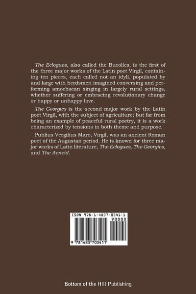 The Eclogues, also called the Bucolics, is the first of the three major works of the Latin poet Virgil, containing ten pieces, each called not an idyll, populated by and large with herdsmen imagined conversing and performing amoebaean singing in largely rural settings, whether suffering or embracing revolutionary change or happy or unhappy love. The Georgics is the second major work by the Latin poet Virgil, with the subject of agriculture; but far from being an example of peaceful rural poetry, it is a work characterized by tensions in both theme and purpose. Publius Vergilius Maro, Virgil, was an ancient Roman poet of the Augustan period. He is known for three major works of Latin literature, The Eclogues, The Georgics, and The Aeneid.