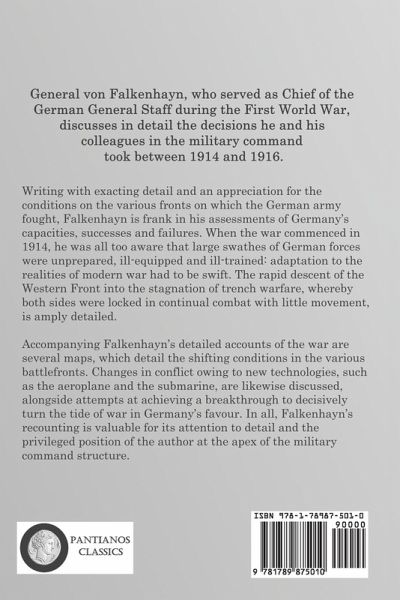 General von Falkenhayn, who served as Chief of the German General Staff during the First World War, discusses in detail the decisions he and his colleagues in the military command took between 1914 and 1916. Writing with exacting detail and an appreciation for the conditions on the various fronts on which the German army fought, Falkenhayn is frank in his assessments of Germany's capacities, successes and failures. When the war commenced in 1914, he was all too aware that large swathes of German forces were unprepared, ill-equipped and ill-trained: adaptation to the realities of modern war had to be swift. The rapid descent of the Western Front into the stagnation of trench warfare, whereby both sides were locked in continual combat with little movement, is amply detailed. Accompanying Falkenhayn's detailed accounts of the war are several maps, which detail the shifting conditions in the various battlefronts. Changes in conflict owing to new technologies, such as the aeroplane and the submarine, are likewise discussed, alongside attempts at achieving a breakthrough to decisively turn the tide of war in Germany's favour. In all, Falkenhayn's recounting is valuable for its attention to detail and the privileged position of the author at the apex of the military command structure.