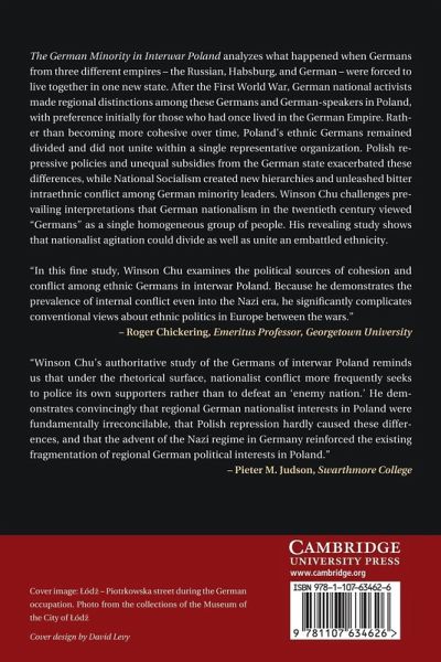 The German Minority in Interwar Poland analyzes what happened when Germans from three different empires - the Russian, Habsburg and German - were forced to live together in one new state. After the First World War, German national activists made regional distinctions among these Germans and German-speakers in Poland, with preference initially for those who had once lived in the German Empire. Rather than becoming more cohesive over time, Poland's ethnic Germans remained divided and did not unite within a single representative organization. Polish repressive policies and unequal subsidies from the German state exacerbated these differences, while National Socialism created new hierarchies and unleashed bitter intra-ethnic conflict among German minority leaders. Winson Chu challenges prevailing interpretations that German nationalism in the twentieth century viewed 'Germans' as a single homogeneous group of people. His revealing study shows that nationalist agitation could divide as well as unite an embattled ethnicity.