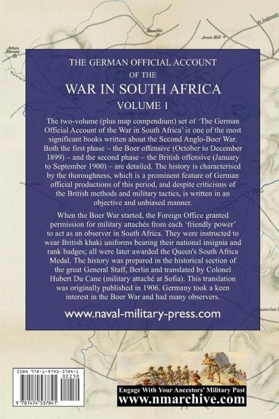 The two-volume (+ map compendium) set of 'The German Official Account of the War in South Africa' is one of the most significant books written about the Second Anglo-Boer War. Both the first phase - the Boer offensive (October to December 1899) - and the second phase - the British offensive (January to September 1900) - are detailed. The history is characterised by the thoroughness, which is a prominent feature of German official productions of this period, and despite criticisms of the British methods and military tactics, is written in an objective and unbiased manner. The conflict broke out in 1899 after the failure of the Bloemfontein Conference when Boer irregulars and militia attacked colonial settlements in nearby British colonies. Starting in October 1899, the Boers placed Ladysmith, Kimberley and Mafeking under siege, and won a string of victories at Colenso, Magersfontein and Stormberg. In response to these developments, increased numbers of British Army soldiers were brought to Southern Africa and mounted largely unsuccessful attacks against the Boers. However, British military fortunes changed when their commanding officer, General Redvers Buller, was replaced by Lord Roberts and Lord Kitchener, who relieved the three besieged cities and invaded the two Boer Republics in early 1900 at the head of a 180,000-strong expeditionary force. The Boers, aware they were unable to resist such a large force, chose to refrain from fighting pitched battles, allowing the British to occupy both republics and their capitals, Pretoria and Bloemfontein. When the Boer War started, the Foreign Office granted permission for military attachés from each 'friendly power' to act as an observer in South Africa. They were instructed to wear British khaki uniforms bearing their national insignia and rank badges; all were later awarded the Queen's South Africa Medal. The history was prepared in the historical section of the great General Staff, Berlin and translated by Colonel Hubert Du Cane (military attaché at Sofia). This translation was originally published in 1906. Germany took a keen interest in the Boer War and had many observers.