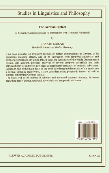 "This book provides an in-depth overview of perfect constructions in German and offers an extensive account of their uses from the perspective of a formal semantic framework. It also considers many pragmatic factors as well as particular characteristics of German Syntax...A thorough conclusion, list of references, and index make this work a useful manual for (advanced) students and scholars."(Linde Roels, LANGUAGE, volume 81, issue 3, page 784, 2005)