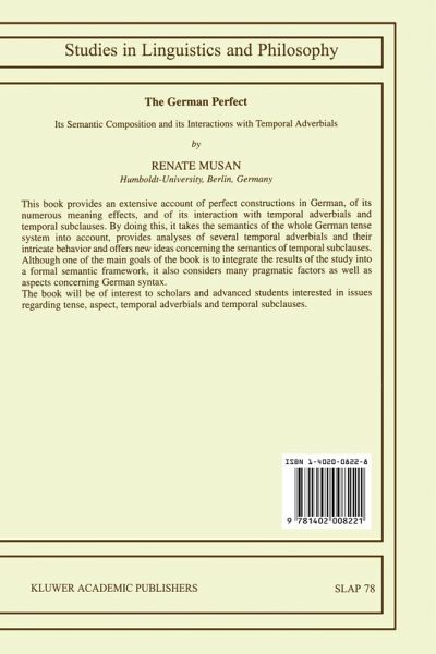 "This book provides an in-depth overview of perfect constructions in German and offers an extensive account of their uses from the perspective of a formal semantic framework. It also considers many pragmatic factors as well as particular characteristics of German Syntax...A thorough conclusion, list of references, and index make this work a useful manual for (advanced) students and scholars."(Linde Roels, LANGUAGE, volume 81, issue 3, page 784, 2005)