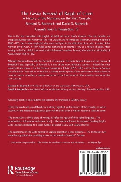 This is the first translation into English of Ralph of Caen's Gesta Tancredi. This text provides an exceptionally important narrative of the First Crusade and its immediate aftermath, covering the period 1096-1105, but is often neglected, due in no small part to the difficulties of its Latin. A native of the Norman city of Caen where he was a student of Arnulf, the future patriarch of Jerusalem, in 1107 Ralph joined Bohemond of Taranto's army as a military chaplain. After arriving in the East, Ralph took service with Bohemond's nephew Tancred, who ruled the principality of Antioch from 1108 to 1112. Although dedicated to Arnulf, the Gesta Tancredi focuses on the careers of Bohemond and, especially, of Tancred. It is one of the most important sources - indeed the most important Latin source - for the Norman campaigns in Cilicia (1097-1108), and for the early Norman rule of Antioch. The work as a whole has a striking Norman point of view and contains details found in no other source, providing a corrective to the strong northern focus of most of the other narrative sources for the First Crusade.