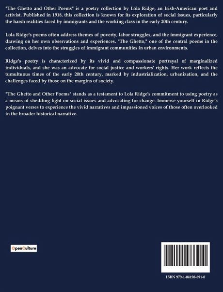 "The Ghetto and Other Poems" is a poetry collection by Lola Ridge, an Irish-American poet and activist. Published in 1918, this collection is known for its exploration of social issues, particularly the harsh realities faced by immigrants and the working class in the early 20th century. Lola Ridge's poems often address themes of poverty, labor struggles, and the immigrant experience, drawing on her own observations and experiences. "The Ghetto," one of the central poems in the collection, delves into the struggles of immigrant communities in urban environments. Ridge's poetry is characterized by its vivid and compassionate portrayal of marginalized individuals, and she was an advocate for social justice and workers' rights. Her work reflects the tumultuous times of the early 20th century, marked by industrialization, urbanization, and the challenges faced by those on the margins of society. "The Ghetto and Other Poems" stands as a testament to Lola Ridge's commitment to using poetry as a means of shedding light on social issues and advocating for change. Immerse yourself in Ridge's poignant verses to experience the vivid narratives and impassioned voices of those often overlooked in the broader historical narrative.