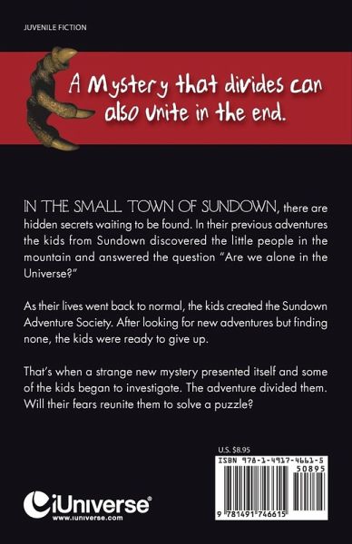 IN THE SMALL TOWN OF SUNDOWN, there are hidden secrets waiting to be found. In their previous adventures the kids from Sundown discovered the little people in the mountain and answered the question "Are we alone in the Universe?" As their lives went back to normal, the kids created the Sundown Adventure Society. After looking for new adventures but finding none, the kids were ready to give up. That's when a strange new mystery presented itself and some of the kids began to investigate. The adventure divided them. Will their fears reunite them to solve a puzzle?