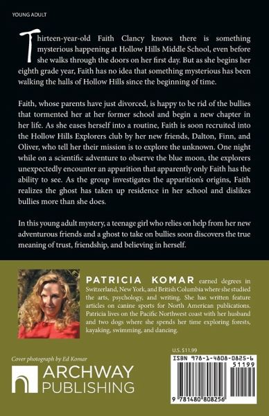 Thirteen-year-old Faith Clancy knows there is something mysterious happening at Hollow Hills Middle School, even before she walks through the doors on her first day. But as she begins her eighth grade year, Faith has no idea that something mysterious has been walking the halls of Hollow Hills since the beginning of time. Faith, whose parents have just divorced, is happy to be rid of the bullies that tormented her at her former school and begin a new chapter in her life. As she eases herself into a routine, Faith is soon recruited into the Hollow Hills Explorers club by her new friends, Dalton, Finn, and Oliver, who tell her their mission is to explore the unknown. One night while on a scientific adventure to observe the blue moon, the explorers unexpectedly encounter an apparition that apparently only Faith has the ability to see. As the group investigates the apparition's origins, Faith realizes the ghost has taken up residence in her school and dislikes bullies more than she does. In this young adult mystery, a teenage girl who relies on help from her new adventurous friends and a ghost to take on bullies soon discovers the true meaning of trust, friendship, and believing in herself.