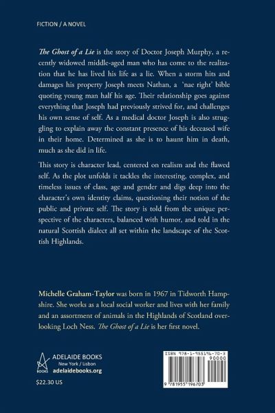 The Ghost of a Lie is the story of Doctor Joseph Murphy, a recently widowed middle-aged man who has come to the realization that he has lived his life as a lie. When a storm hits and damages his property Joseph meets Nathan, a 'nae right' bible quoting young man half his age. Their relationship goes against everything that Joseph had previously strived for, and challenges his own sense of self. As a medical doctor Joseph is also struggling to explain away the constant presence of his deceased wife in their home. Determined as she is to haunt him in death, much as she did in life. This story is character lead, centered on realism and the flawed self. As the plot unfolds it tackles the interesting, complex, and timeless issues of class, age and gender and digs deep into the character's own identity claims, questioning their notion of the public and private self. The story is told from the unique perspective of the characters, balanced with humor, and told in the natural Scottish dialect all set within the landscape of the Scottish Highlands. Michelle Graham-Taylor was born in 1967 in Tidworth Hampshire. She works as a local social worker and lives with her family and an assortment of animals in the Highlands of Scotland overlooking Loch Ness. The Ghost of a Lie is her first novel.