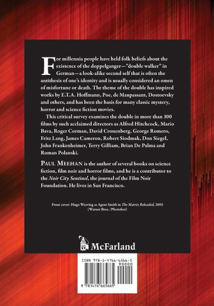 For millennia people have held folk beliefs about the existence of the doppelganger--""double walker"" in German--a look-alike second self that is often the antithesis of one's identity and is usually considered an omen of misfortune or death. The theme of the double has inspired works by E.T.A. Hoffmann, Poe, de Maupassant, Dostoevsky and others, and has been the basis for many classic mystery, horror and science fiction movies. This critical survey examines the double in more than 100 films by such acclaimed directors as Alfred Hitchcock, Mario Bava, Roger Corman, David Cronenberg, George Romero, Fritz Lang, James Cameron, Robert Siodmak, Don Siegel, John Frankenheimer, Terry Gilliam, Brian De Palma and Roman Polanski.