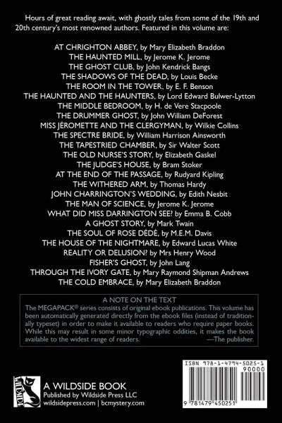 Hours of great reading await, with ghostly tales from some of the 19th and 20th century's most renowned authors. Featured in this volume are:: AT CHRIGHTON ABBEY, by Mary Elizabeth Braddon THE HAUNTED MILL, by Jerome K. Jerome THE GHOST CLUB, by John Kendrick Bangs THE SHADOWS OF THE DEAD, by Louis Becke THE ROOM IN THE TOWER, by E. F. Benson THE HAUNTED AND THE HAUNTERS, by Lord Edward Bulwer-Lytton THE MIDDLE BEDROOM, by H. de Vere Stacpoole THE DRUMMER GHOST, by John William DeForest MISS JÉROMETTE AND THE CLERGYMAN, by Wilkie Collins THE SPECTRE BRIDE, by William Harrison Ainsworth THE TAPESTRIED CHAMBER; or, The Lady in the Square, by Sir Walter Scott THE OLD NURSE'S STORY, by Elizabeth Gaskell THE JUDGE'S HOUSE, by Bram Stoker AT THE END OF THE PASSAGE, by Rudyard Kipling THE WITHERED ARM, by Thomas Hardy JOHN CHARRINGTON'S WEDDING, by Edith Nesbit THE MAN OF SCIENCE, by Jerome K. Jerome WHAT DID MISS DARRINGTON SEE? by Emma B. Cobb A GHOST STORY, by Mark Twain THE SOUL OF ROSE DÉDÉ, by M.E.M. Davis THE HOUSE OF THE NIGHTMARE, by Edward Lucas White REALITY OR DELUSION? by Mrs Henry Wood FISHER'S GHOST, by John Lang THROUGH THE IVORY GATE, by Mary Raymond Shipman Andrews THE COLD EMBRACE, by Mary Elizabeth Braddon And don't forget to check out the 350+ other volumes in the MEGAPACK® series! Search on "Wildside Press Megapack" in your favorite ebook store to see the complete list...covering science fiction, fantasy, horror, westerns, mysteries, and much more!